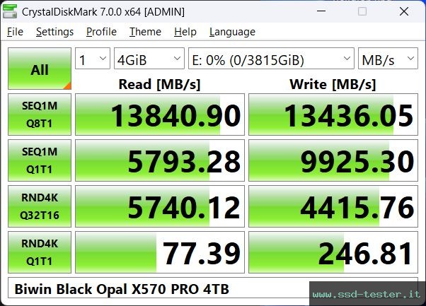 Qui, la velocità di scrittura e di lettura (secondo il produttore 14000 MB/s e 13000 MB/s) il Biwin SSD viene misurata in base alla comprimibilità dei dati.